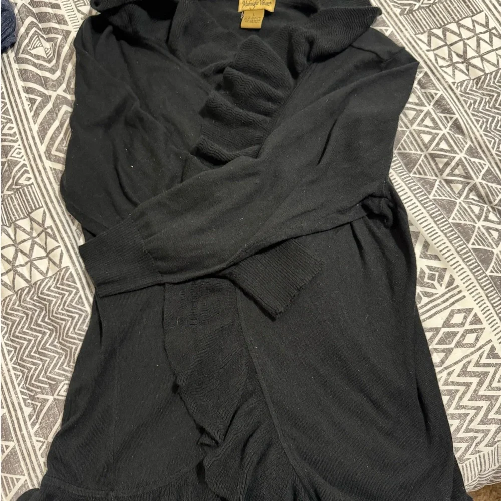 Elegant black cardigan with ruffled details. Perfect for layering.