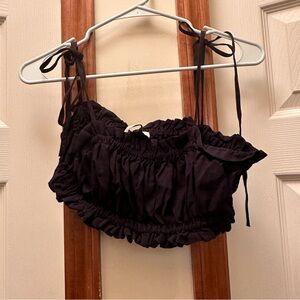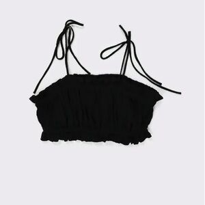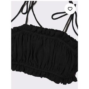 Chic and stylish black ruffled crop top with adjustable straps. Perfect for any occasion.