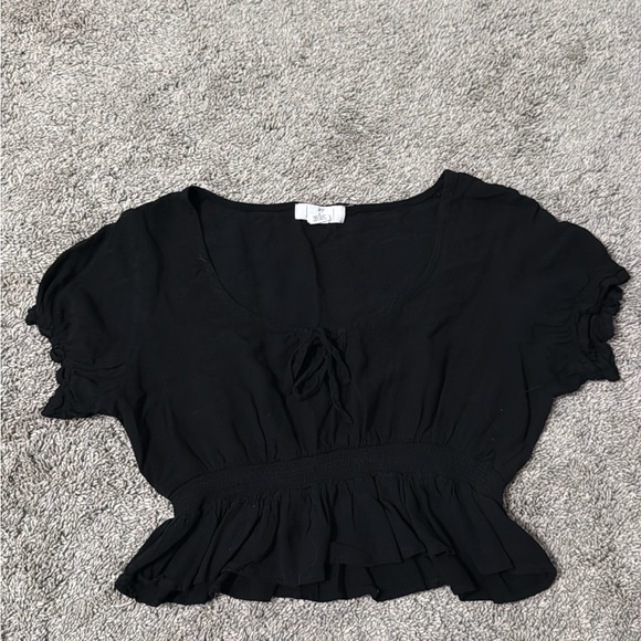 Stylish black crop top with elegant ruffles, perfect for any occasion.