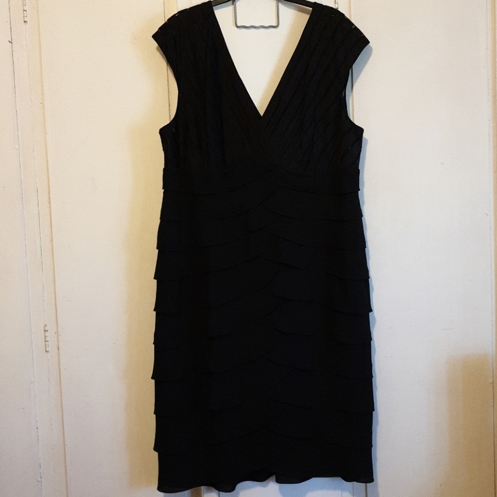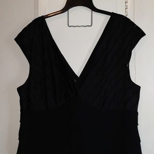 Black dress, ruffled all alone the bottom part of the dress, top is a V shaped with no sleeve.