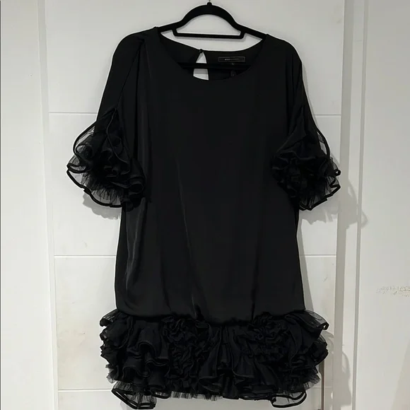 Elegant black dress with ruffled sleeves and hem. Can be dressed up or down. In good condition.