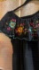 This hand-stitched chic black blouse showcases a dramatic ruffled collar with exquisite red, teal, yellow, pink, and green embellishments, creating a captivating focal point. The sleeveless design and soft fabric make it ideal for a breezy, stylish look. Perfect for adding a touch of elegance to any ensemble.