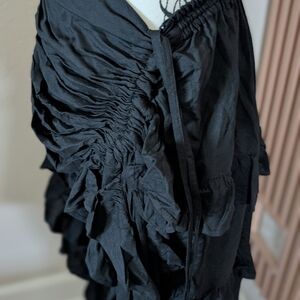 Chic black ruffled high-low skirt with gathered detailing. Lightweight layered design adds movement and feminine flair. Versatile piece that pairs easily with casual or dressy tops. Black color offers timeless styling options.