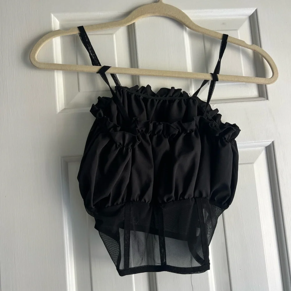 Stylish black ruffled top with mesh details. Perfect for a chic look.