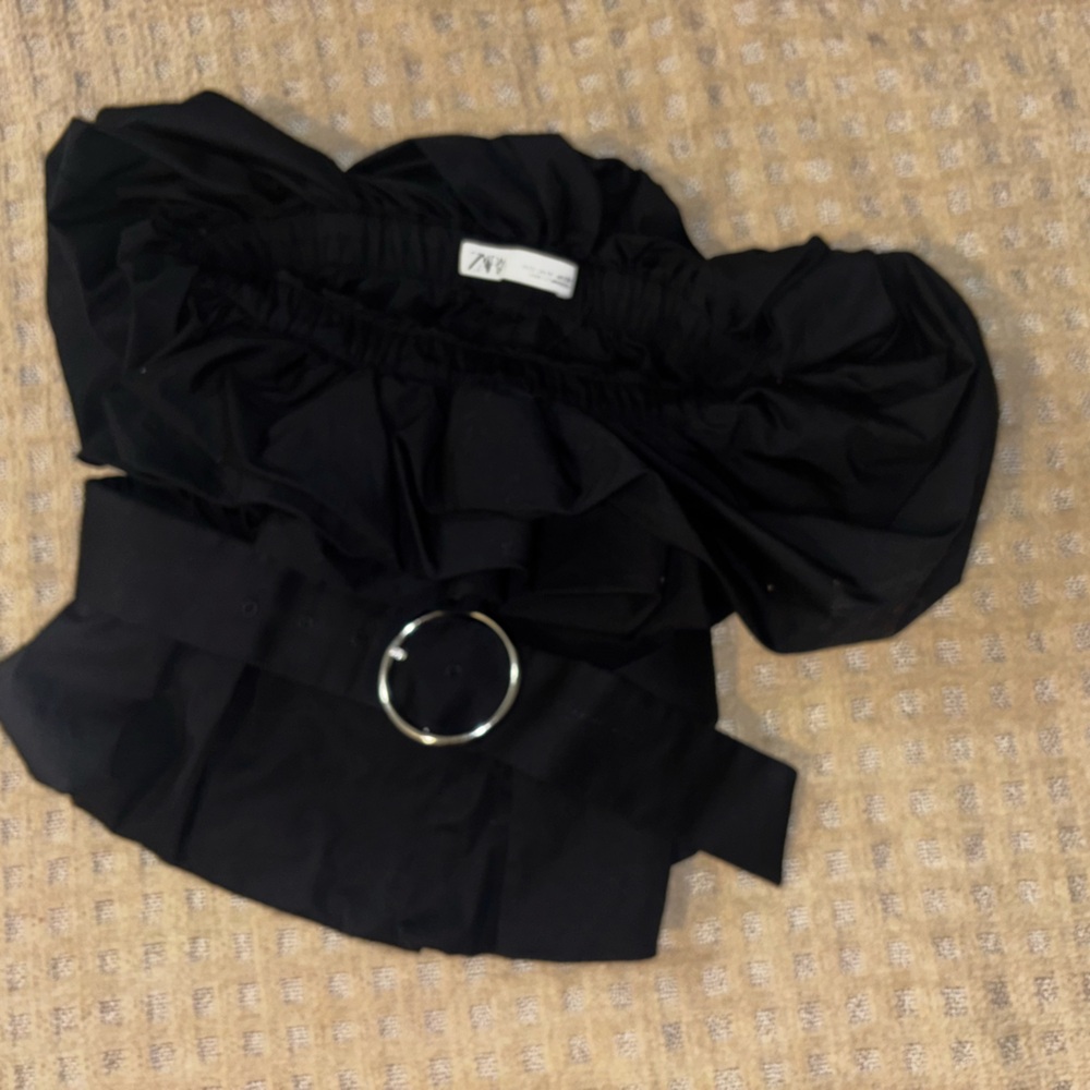 Stylish black off-shoulder top (strapless shirt) with ruffle details. Features a silver ring accent. Size Small