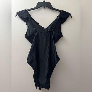 Chic and stylish black one piece for women with elegant ruffle detailing. Has a cut front tie on tummy area. Perfect for any occasion. New without tags came out of a plastic bag. Does have the protective liner. Women’s size small.