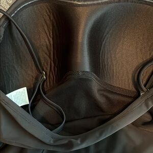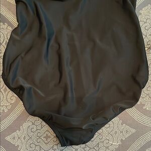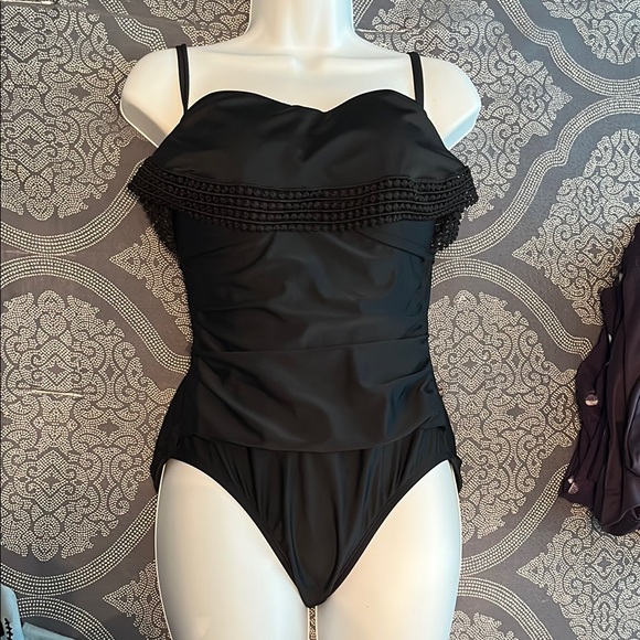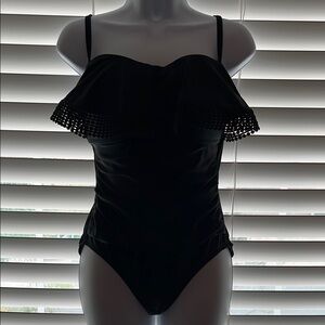 Stylish black one-piece swimsuit with ruffle detailing. Perfect for a chic beach look.