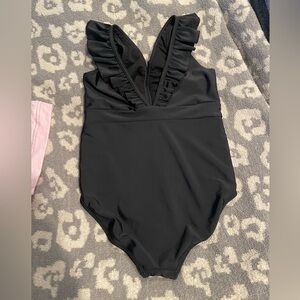 Stylish black leotard with ruffle detailing. Perfect for ballet class!