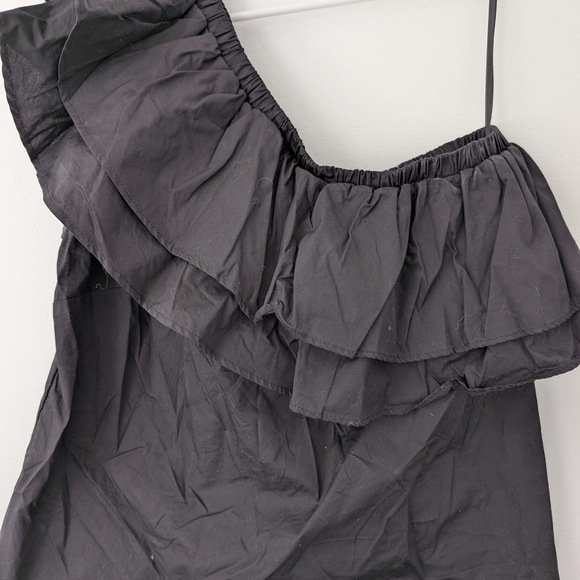 Stylish black one-shoulder top with ruffle detail. Perfect for a chic look.
