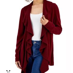Elegant black cardigan with ribbed texture. Ideal for layering. Size women’s XL from the brand Karen Scott. Good condition. (Please note that I have added a photo from Macys.com of this cardigan in red to better show the style as it’s a difficult item to photograph but the actual item is in fact black not red!)