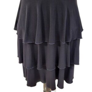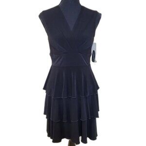 This sophisticated black mini dress features a sleeveless design with a chic V-neckline. The fit and flare silhouette is enhanced by a peplum waist and a tiered ruffle skirt, perfect for cocktail occasions. Its luxurious fabric ensures a stunning look for any night out.