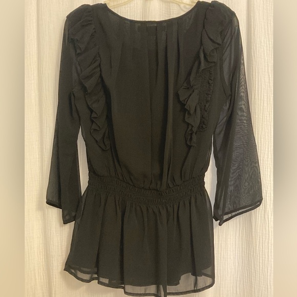 Elegant black blouse with ruffled details and sheer sleeves. Perfect for any occasion.