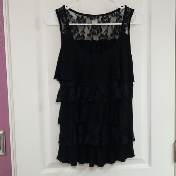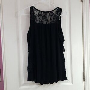 Black ruffled tank top. Tag lists "1xl"; fits like XL. Gently worn. Lace material on ruffles, shoulders and back as shown in photos.