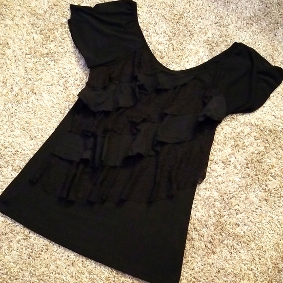 This is a short sleeved, scooped neck black ruffled top. It measures 30" from the shoulder to the hem. The ruffles are a combination lace and fabric. It can be worn with jeans, a skirt or jeggings.