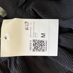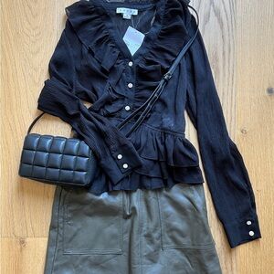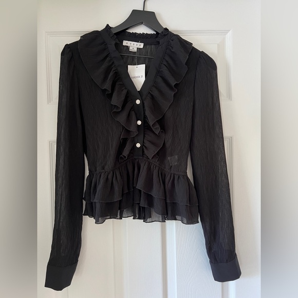 NWT. Size Medium. Silver button detail down the front and along the sleeve cuffs. This elegant black ruffled top is perfect for any occasion. Its chic design adds a touch of sophistication to your wardrobe.