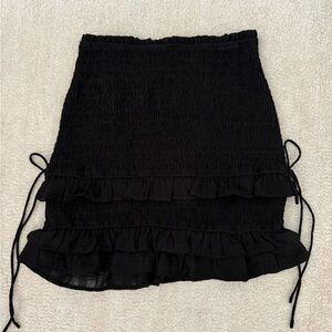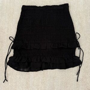 black two-piece set with ruffled details. Includes a long-sleeve top and matching skirt. Both size medium