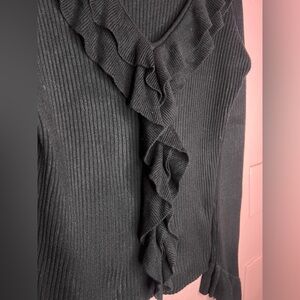 Elegant black sweater with ruffled V-neck design. Perfect for any occasion.