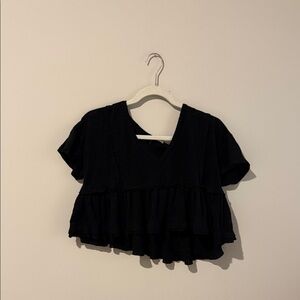Stylish black top with a V-neck and ruffled hem. Perfect for casual outings.
