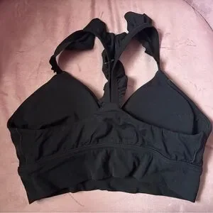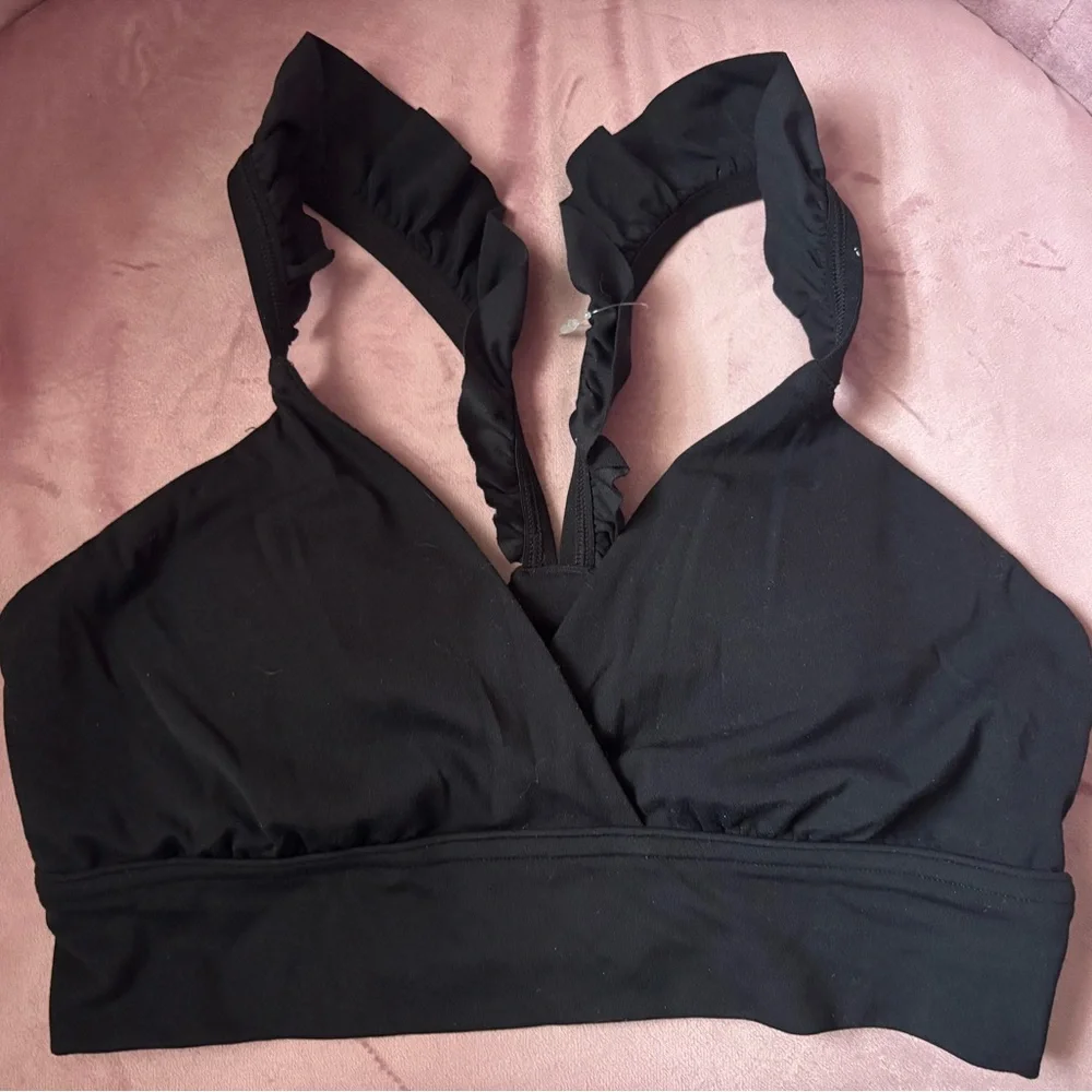 black sports bra with ruffled straps for a stylish touch. Perfect for comfort and support.