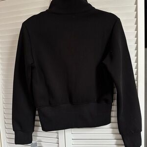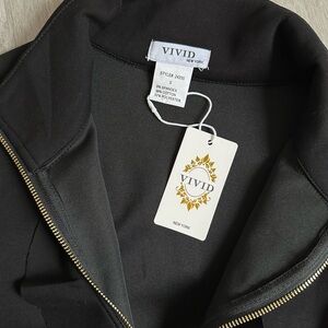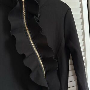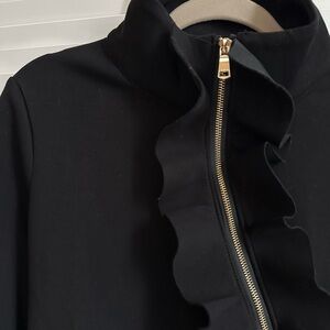 Stylish black jacket with a ruffled front and zip closure. Perfect for a chic look.