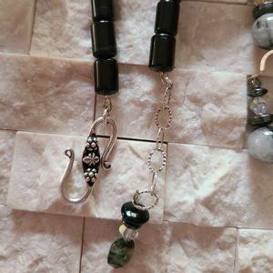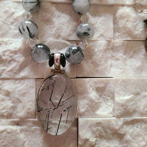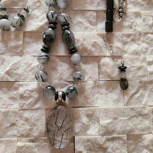 Sterling Silver wrapped Oval pendant of Black Rutilated Quartz hangs 2" below necklace, approx 20" long, Bali Silver "S" hook with raised embellishments: approx 1" long, 2-1/2" extender with dangle. Black Rutilated Quart in smooth rounds & puffed faceted ovals, black onyx rondels & tubes, Crystal, Hematite rondels, black "Mirrored" glass twisted oval. Ear rings approx 1-1/2": Sterling Silver wires with coil. Round Black Rutilated Quartz, Hematite rondel, Crystal & small Hematite disc.