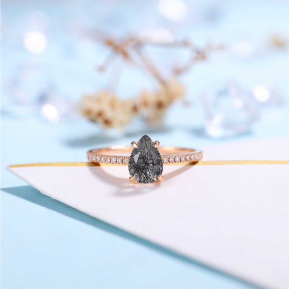 Black Rutilated Quartz Ring. Vintage Rose Gold Band. Pear cut. Moissanite/Diamond Half Eternity Anniversary ring. Solid 18K Rose Gold.