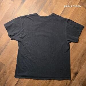 black graphic tee, street style, oversized fit, logo print, casual top, urban fashion, dark tone, cotton fabric, bold design, relaxed fit