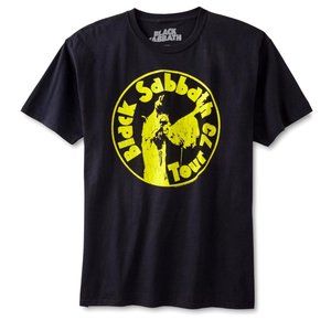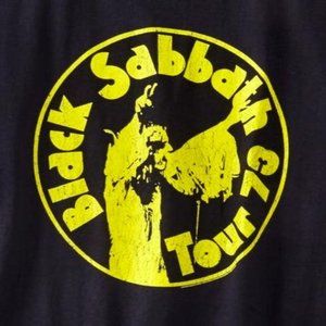 This black t-shirt features Black Sabbath Tour '73 circle Logo with Ozzy Osbourne in a yellow over black graphic. 100% Cotton.
