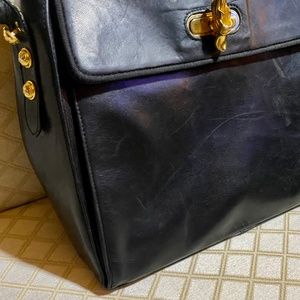 Genuine leather handbag. Gold hardware with signature shoe clasp. Straps slightly worn. Originally purchased at Saks.