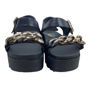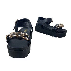 Stylish black sandals featuring a bold gold chain accent. Perfect for adding a touch of elegance to any outfit.
