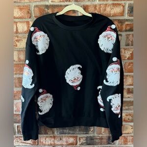 Festive black sweatshirt with Santa Claus design. Perfect for holiday celebrations. Size large. Smoke free home. Light pilling in some spots, see photo