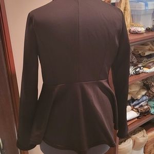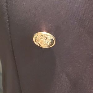 Fitted black satin blazer with gold buttons. Peplum bottom.