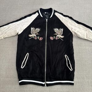 Black Satin Bomber Jacket w/ Embroidered Hawk + Rose Patches Japanese Style XS