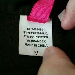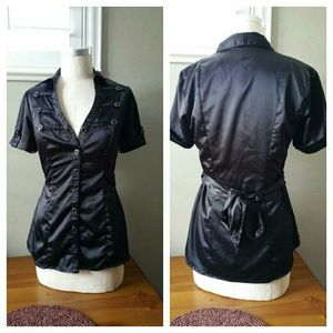 Black Satin Button Down with Tie Waist in EUC with no flaws. Cute, fun, can wear a couple of ways, seen in pics 1 and 3. Has interesting design details. Junior medium, ladies small. Measurements are: Length is 26", Bust width is 17.5", midwaist width is 15", waist width at the bottom is 18", Sleeve Length is 8". Material does not stretch so measurements are firm.
