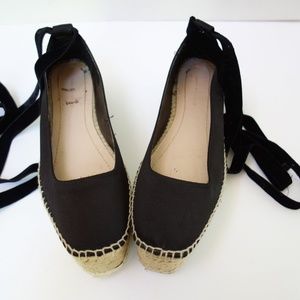 Beautiful Black Satin Jute Espadrilles, Platform Sandals, criss cross ribbon ties, Size 37 Us 7