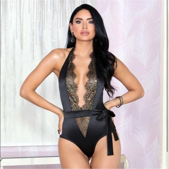 Black Satin Lace Plunging Teddy Size Small with Ribbon Belt & Halter Straps NWT