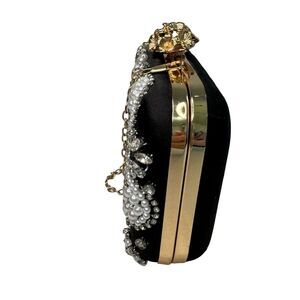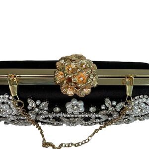 Black Satin Multi Rhinestone and Pearl Accent Chain Clutch Purse Evening Bag