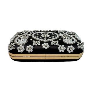 This elegant black satin clutch purse is the perfect accessory for any evening occasion. The multi-rhinestone and pearl accents add a touch of glamour to the classic heart/floral pattern. The bag has a hinged closure and a top handle for easy carrying. The bag measures 8 inches in width, 4.5 inches in height, and 2 inches in depth. It has a detachable chain strap with a drop of 7.5 inches. The interior is lined with black fabric and features a mobile phone pocket. This clutch purse is a must-have for any woman who wants to make a statement.