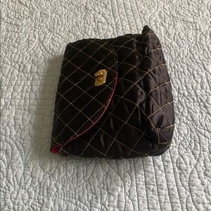This chic clutch features a luxurious quilted texture in a striking black and pink color combination, highlighted by a sophisticated gold-toned closure. Its compact and stylish design makes it a perfect accessory for any occasion. Measures 8.5x3x6”.