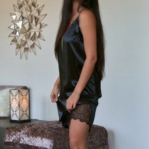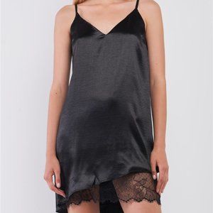 Black Satin Sleeveless Relaxed Fit V-Neck Asymmetrical Lace Hem Detail Slip Mini Dress