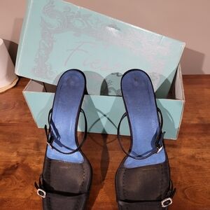 Unisa brand black satin evening sandals with sparkly buckles. Heel is about 2 inches and wide enough for dancing.