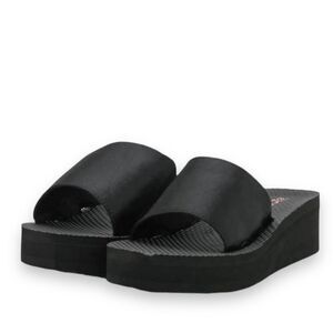 Black Satin Wide Strap Open Toe Slip-Ons Wedge Sandals NEW