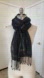 Great for the holidays or any day you want to add a hint of sparkle to your outfit! Lightweight gauzy black fabric (cotton?) with metallic silver thread detail along the perimeter of scarf, striped effect, plaid effect in corners where stripes meet and crossover. GUC (one small area at the end of scarf where the threads have been snagged. Very hard to see while wearing)