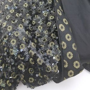 Open front jacket with all over black sequins, black beads and gold flower print.