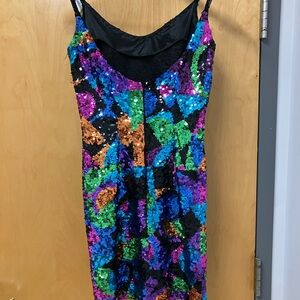Chic black dress adorned with shimmering purple and pink sequins. Ideal for glamorous events.