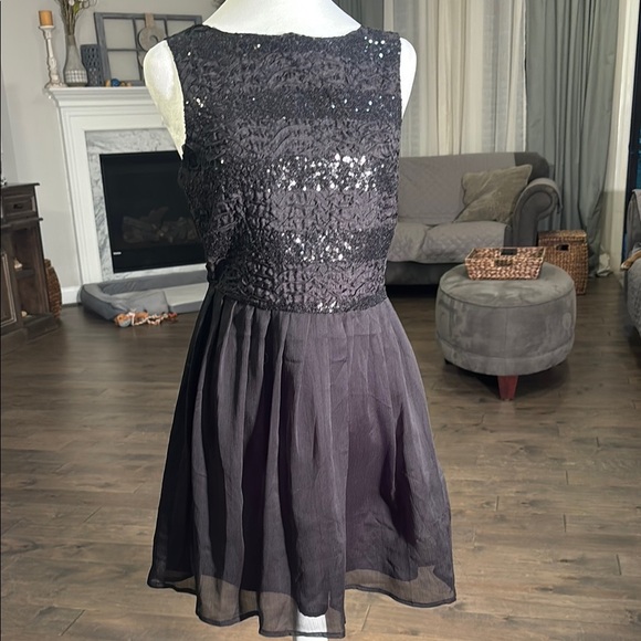 This stunning black mini dress features a sleeveless design with a crew neck, adorned with shimmering sequins for a glamorous touch. Perfect for cocktail events, its fitted silhouette and embellished details make it a standout choice for a night out.