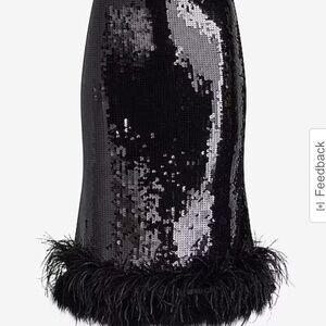Step out in style at your next event this season in this pencil skirt. Featuring a sequin fabric, a feather hem & a midi length, this is sure to turn some heads. Pair with a sweater & heels for a full look.