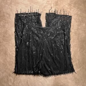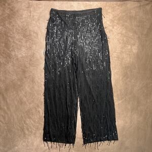 Black Sequin Fringe Sparkle Pants Straight Leg Mesh Party Disco Formal Western
