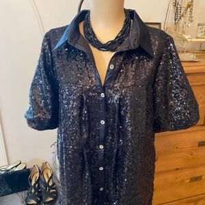 Get your sparkle on! This cute dress is perfect for the holidays! Fully lined with buttons to adjust. I wore has a mini dress, but I also wore this has a jacket with 'faux' leather pants. Both looks were fun and festive! This piece has bubble short sleeves and the dress itself does flare out. At the time I wore it, I was in between size 12-14. It was a little snug across the bust area, but I just unbuttoned another button and wore a tank. Size L