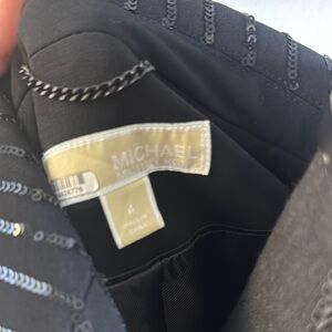 In excellent condition. Stylish black sequin pinstripe blazer. Perfect for a chic look. It may need pressing on the ends, but not bothersome when worn or closed down.